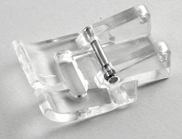 Pé calcador especialmente desenvolvido para apliques com curvas. Por ser de acrílico, permite visualização exata do trabalho e facilita enxergar exatamente aonde está sendo costurado.